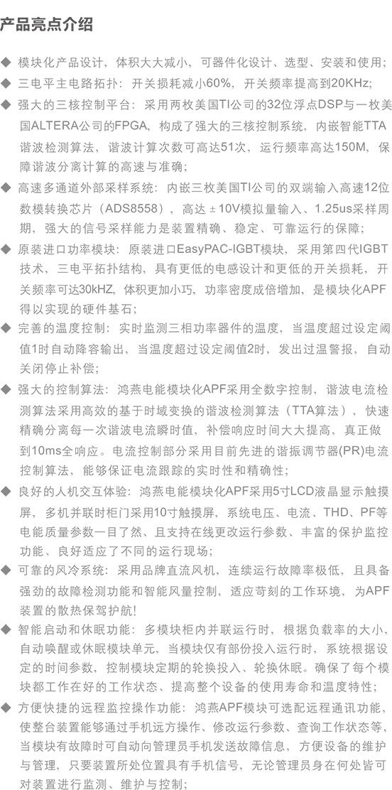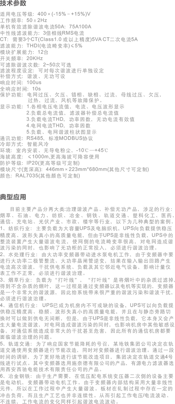 為了進(jìn)一步滿足不同客戶對(duì)于有源電力濾波器的多元化需求,提高用對(duì)諧波治理的智能性、便捷性和穩(wěn)定性,公司推出了全新的模塊化三電平有源濾波裝置。 目前主要產(chǎn)品分兩大類:治理諧波產(chǎn)品、補(bǔ)償無(wú)功產(chǎn)品,涉足的行業(yè):